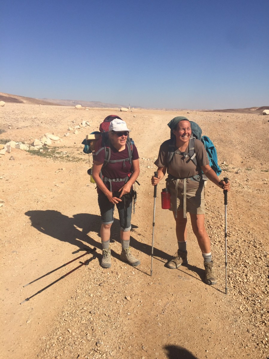 On Thursday the plan was to get to the Dead Sea and meet Arlene, who would get lifts or bus from wherever she was (no easy feat, especially when her feet were killing her). I got a ride down to the Dead Sea with a friend of Michaela’s, an old sailor type who she assured me was harmless. He didn’t speak very good English but wanted my undivided attention. Of course after Arlene and I met up, I quit trying to decipher his broken English. He pouted, ignored us, and then rather unceremoniously dumped my pack in the parking lot. First bad behavior by an Israeli I’ve witnessed so far. I was shocked to see Arlene picking her way painfully across the sand on swollen feet, not quite believing that this girl’s Achilles’ heel was indeed her Achilles’ heel! What a pair! A few weeks ago we were like two fillies prancing at the gate . Now we’re a couple of old mares waiting for the glue factory. How did this happen? Neither of us remembers a specific moment when something “gave”, no searing pain, no warning of trouble to come. Of course, it didn’t help to walk 40 km on a bum knee , but what choice do you have when you are in the middle of a desert wadi with limited water? And Arlene hiked 30+ km a day through rain, knee high mud flats and thorn bushes on tender tendons as well.